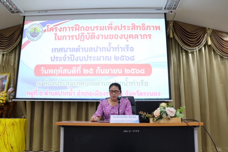 วันที่ 25 กันยายน 2568 เทศบาลตำบลปากน้ำท่าเรือ ดำเนินการจัดโครงการฝึกอบรมเพิ่มประสิทธิภาพในการปฏิบัติงานของบุคลากรเทศบาลตำบลปากน้ำท่าเรือ