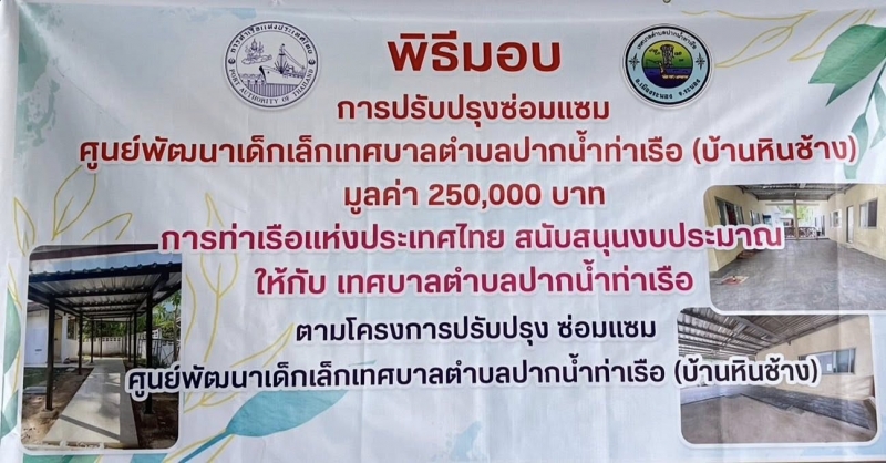 วันที่ 19 กุมภาพันธ์ 2569 นางสาวนารียา ยีซาแล นายกเทศมนตรีตำบลปากน้ำท่าเรือ รับมอบการปรับปรุงซ่อมแซมศูนย์พัฒนาเด็กเล็กเทศบาลตำบลปากน้ำท่าเรือ (บ้านหินช้าง) มูลค่า 250,000 บาท โดยการท่าเรือแห่งประเทศไทย สนับสนุนงบประมาณให้กับเทศบาลตำบลปากน้ำท่าเรือ