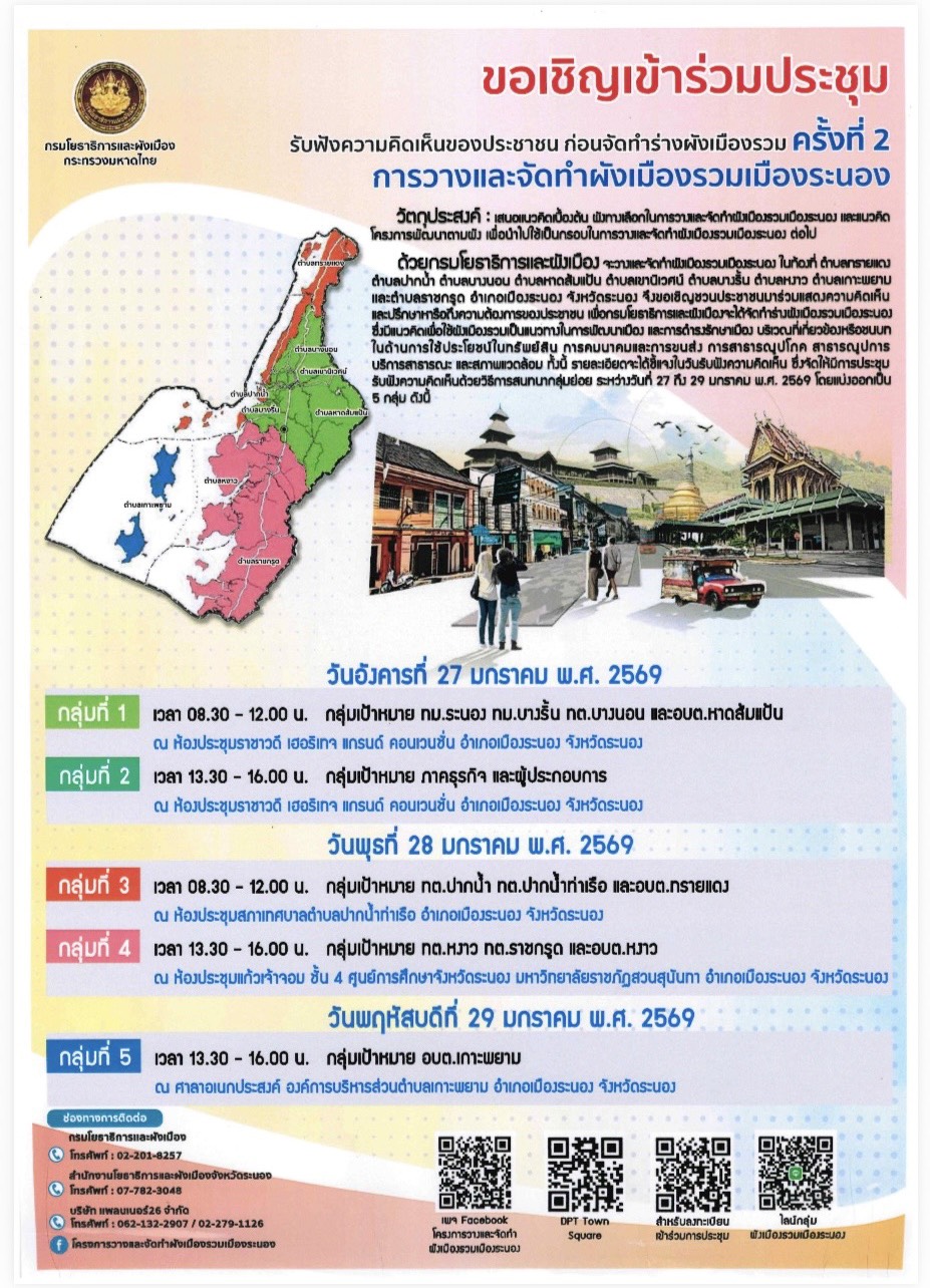 ขอเชิญชวนประชาชนและผู้ที่สนใจเข้าร่วมรับฟังความคิดเห็นของประชาชน ก่อนจัดทำร่างผังเมืองรวม ครั้งที่ 2 การวางและจัดทำผังเมืองรวมเมืองระนอง |