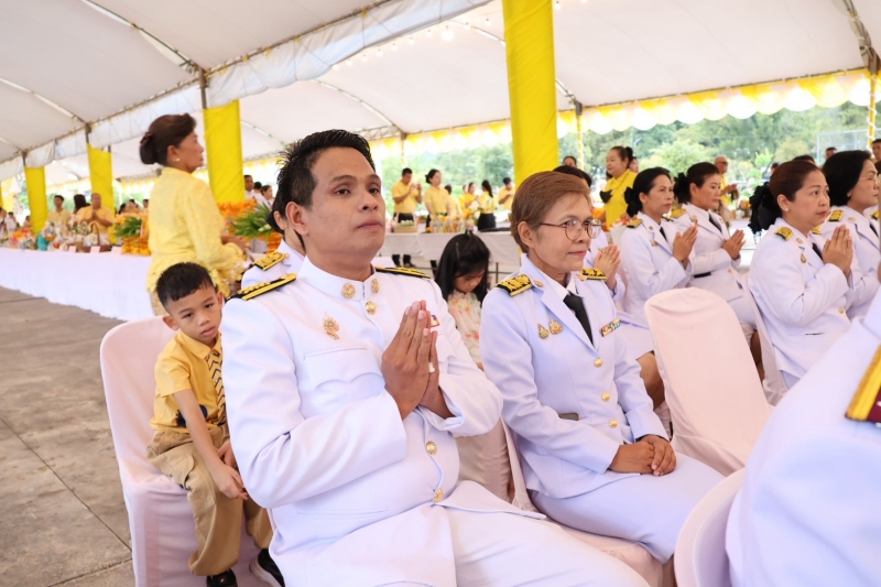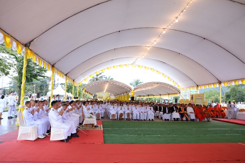 นายสุพจน์ ภูติเกียรติขจร ผู้ว่าราชการจังหวัดระนอง จุดธูปเทียนบูชาพระรัตนตรัย จากนั้นได้ถวายธูปเทียนแพเบื้องหน้าพระบรมฉายาลักษณ์พระบาทสมเด็จพระเจ้าอยู่หัว พระสงฆ์ 10 รูปเจริญพระพุทธมนต์ ก่อนที่ประธานในพิธีจะถวายผ้าไตรพร้อมด้วยหัวหน้าส่วนราชการถวายเครื่องไทยธรรม ในการนี้ผู้นำศาสนาคริสต์ ได้ร่วมอธิษฐานภาวนาขอพร และผู้นำศาสนาอิสลาม ดุอาร์ขอพร แด่พระบาทสมเด็จพระเจ้าอยู่หัว จากนั้นนายสุพจน์ ภูติเกียรติขจร ผู้ว่าราชการจังหวัดระนอง พร้อมด้วยพสกนิกร ได้ร่วมทำบุญตักบาตรแก่พระสงฆ์และสามเณร จำนวน 74 รูป