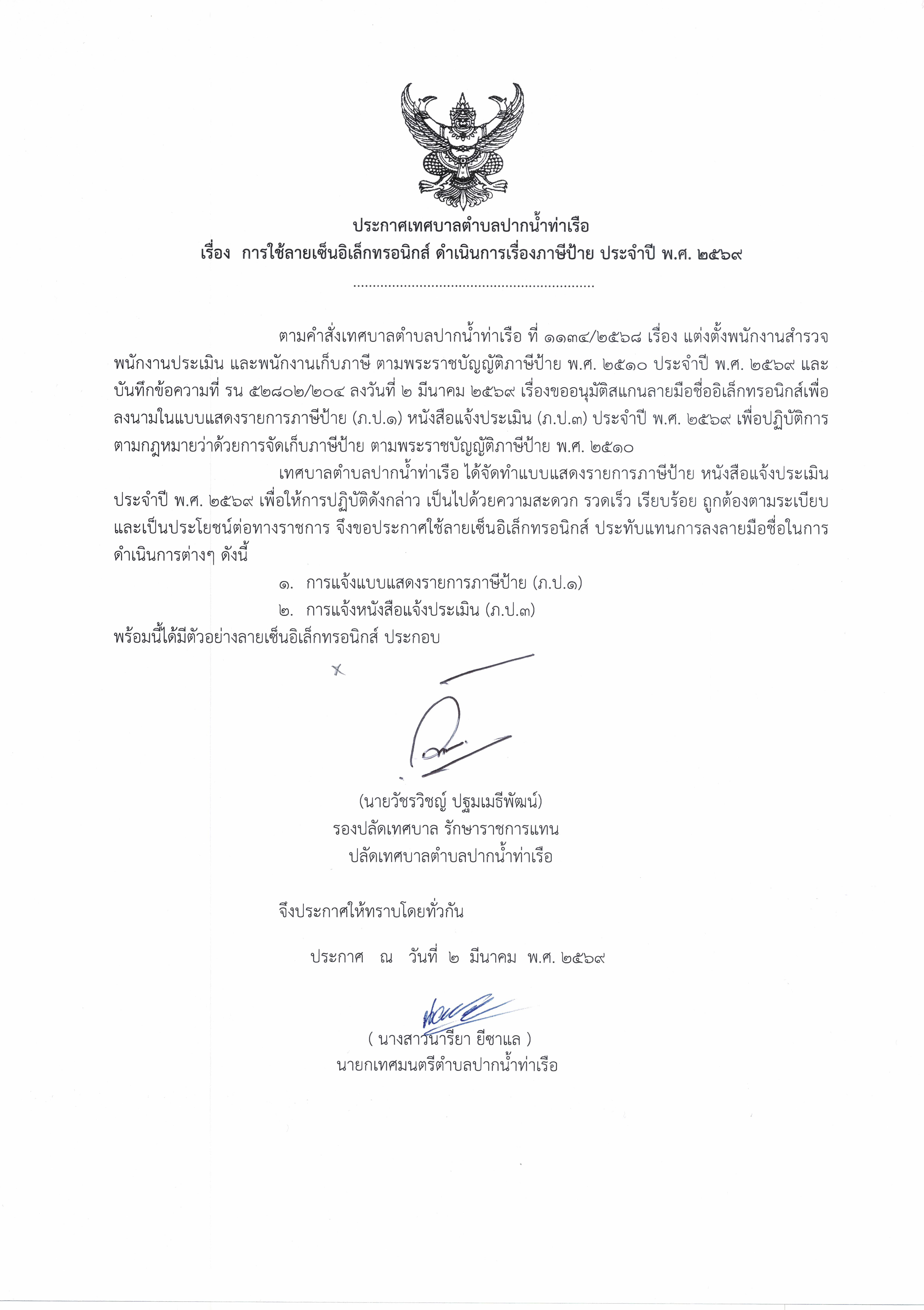 ประกาศเทศบาลตำบลปากน้ำท่าเรือ เรื่อง การใช้ลายเช็นอิเล็กทรอนิกส์ ดำเนินการเรื่องภาษีที่ดินและสิ่งปลูกสร้าง ประจำปี ๒๕๖๙ |