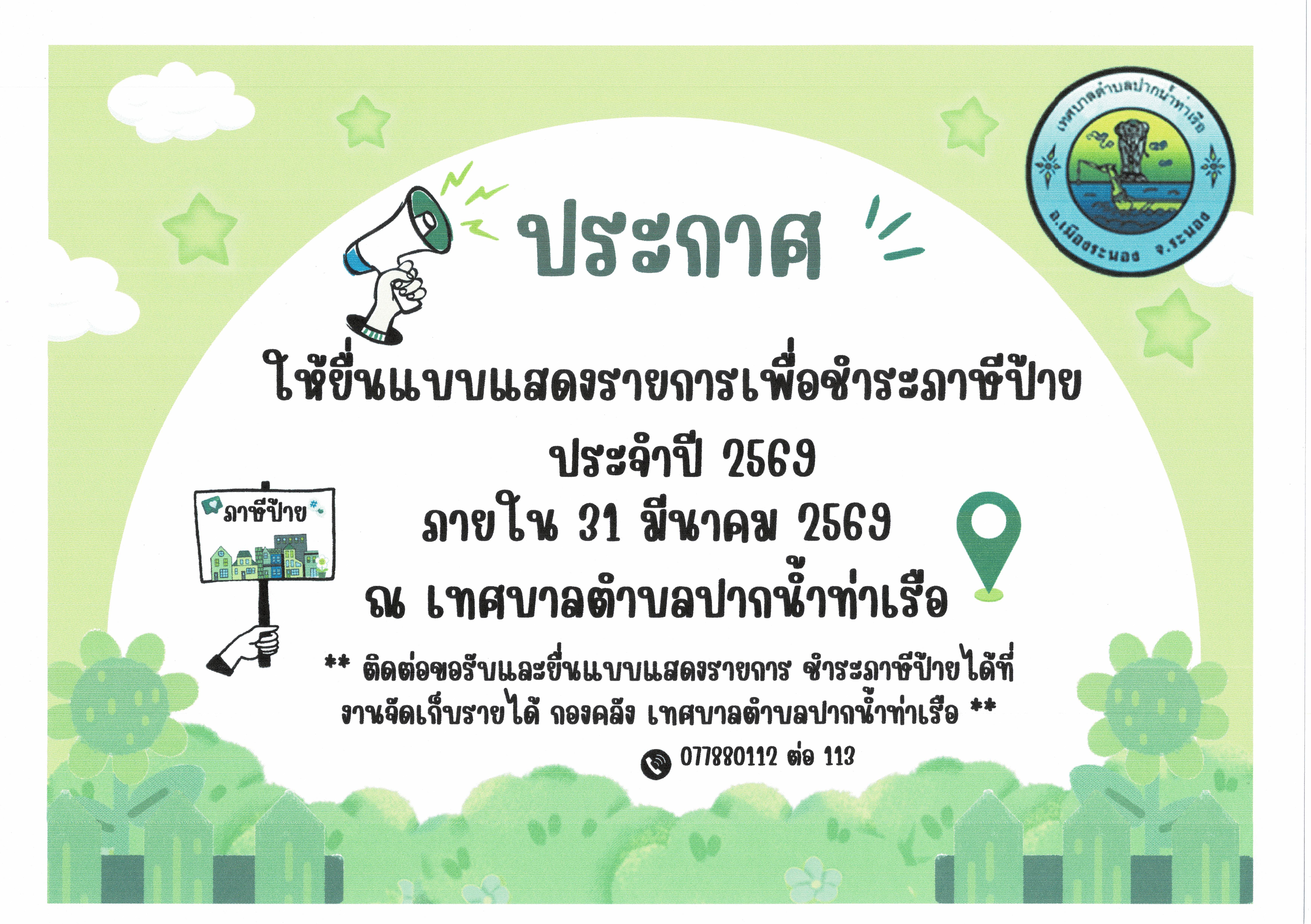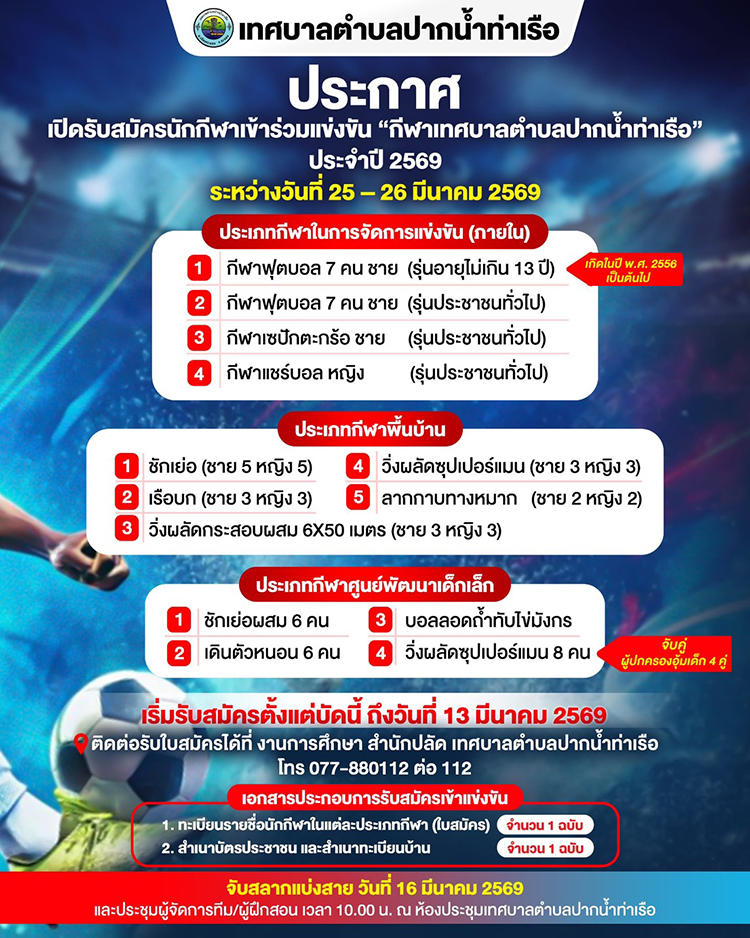 ประกาศเทศบาลตำบลปากน้ำท่าเรือ รับสมัครนักกีฬา เพื่อเข้าร่วมการแข่งขันกีฬาเทศบาลตำบลปากน้ำท่าเรือ ประจำปี 2569 ระหว่างวันที่ 25-26 มีนาคม 2569