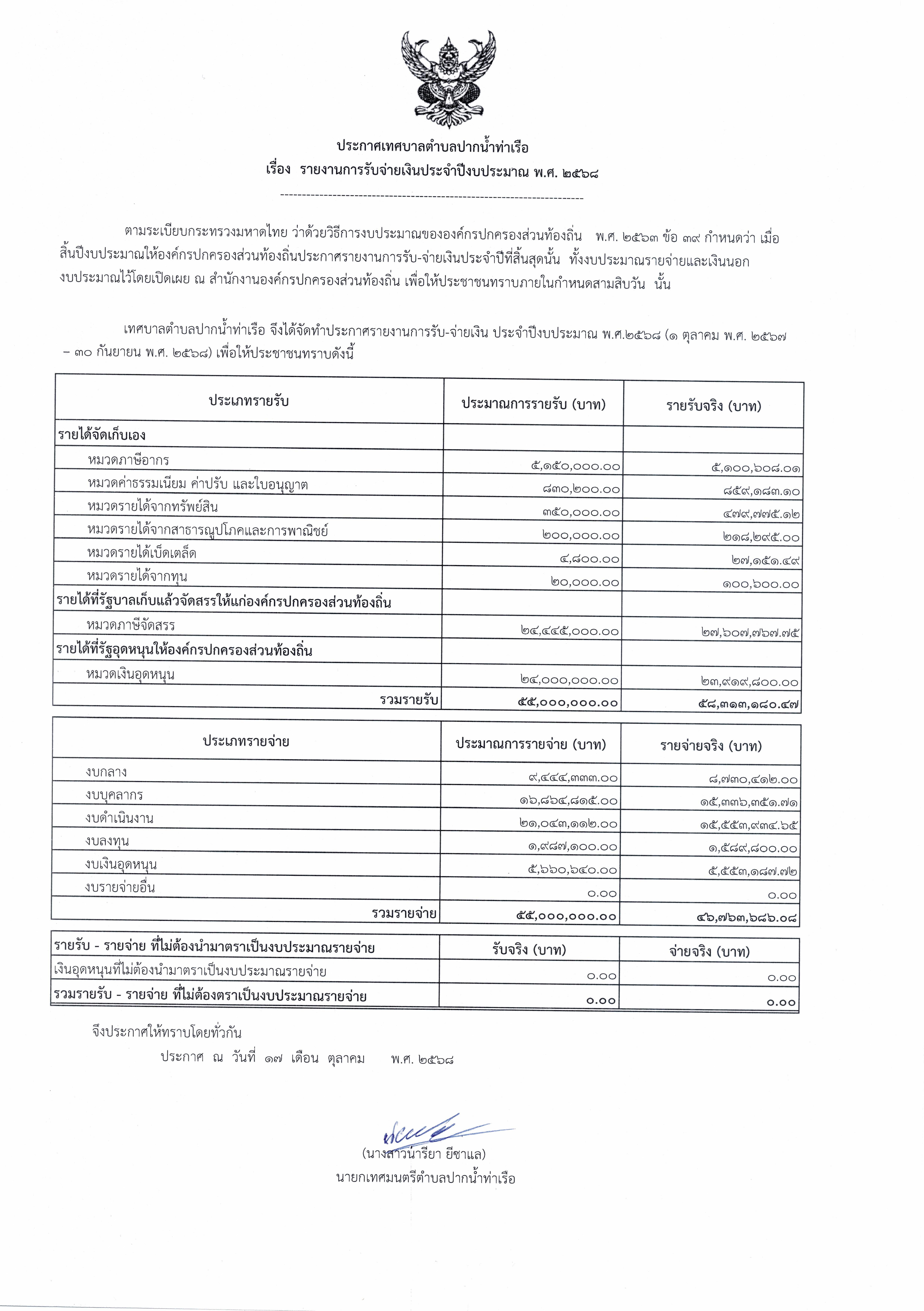 ประกาศสภาเทศบาลตำบลปากน้ำท่าเรือ เรื่อง รายงานการรับจ่ายเงินประจำปีงบประมาณ พ.ศ.๒๕๖๘ |