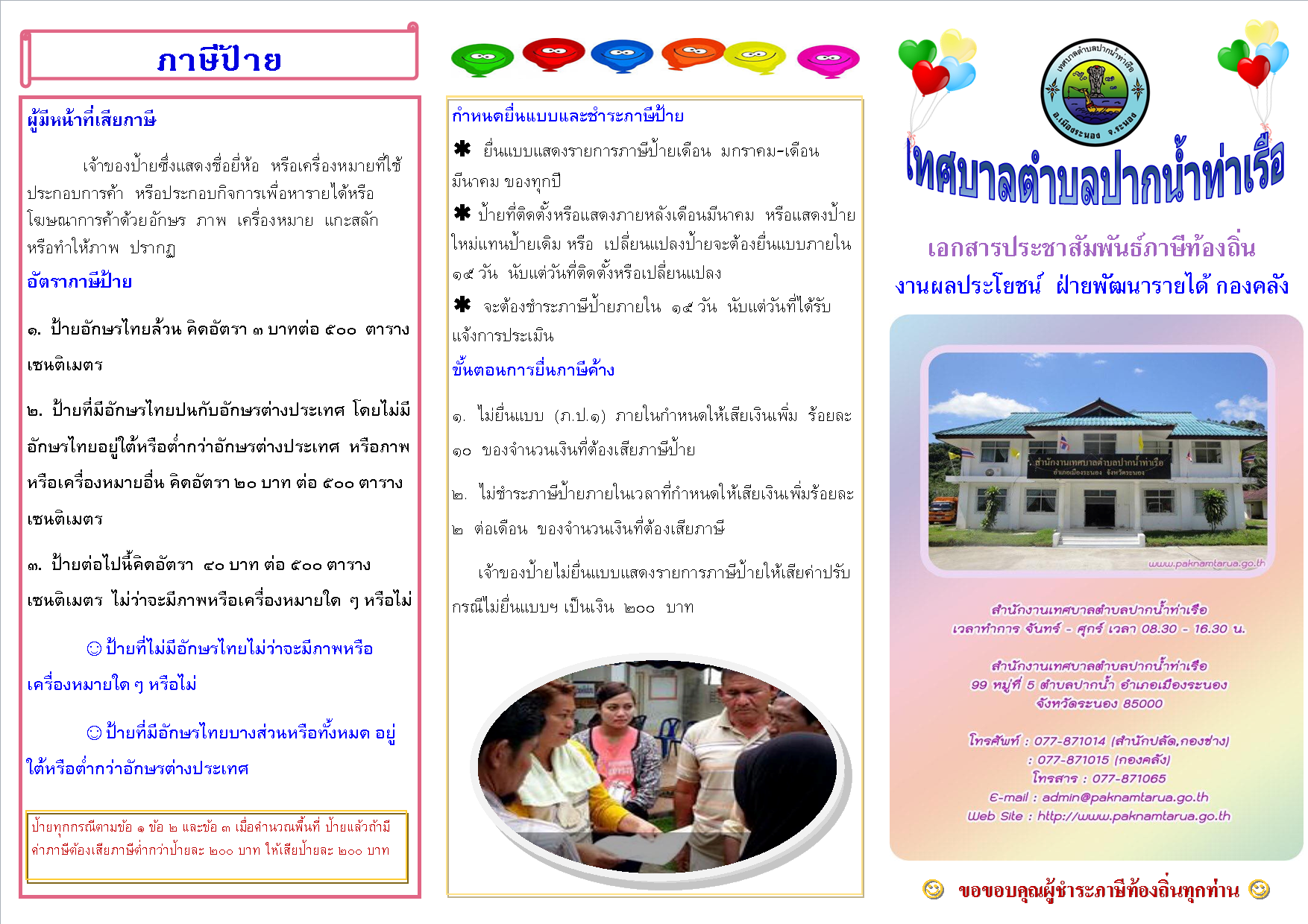 ประกาศเทศบาลตำบลปากน้ำท่าเรือ เรื่อง ให้เจ้าของป้ายที่ตั้งอยู่ในเขตเทศบาลตำบลปากน้ำท่าเรือ ยื่นแบบเพื่อชำระภาษี อันต้องเสียภาษีป้าย ประจำปี พ.ศ.๒๕๕๙ ไปรับแบบพิมพ์ และกรอกรายการในแบบพิมพ์ ยื่นต่อพนักงานเจ้าหน้าที่ |